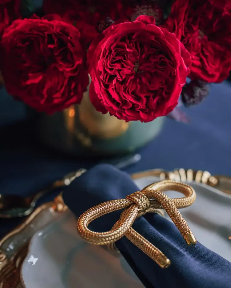 Elegant winter styling ideas for your home, showcasing the sumptuous and velvety red blooms of Tess (Ausyacht), brought to life by the artistry of Janne Ford. A rich palette of dark reds, deep purples, matte and polished golds, paired with jewel tones, creates a stunning setting for Christmas or New Year celebrations.